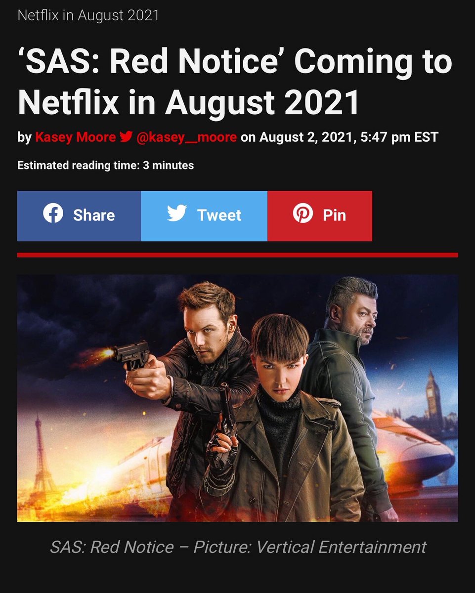Red Notice as its referred to in some places will be making its SVOD debut on Netflix US on August 27th 2021. Red Notice Film SAS. The release time for SAS.